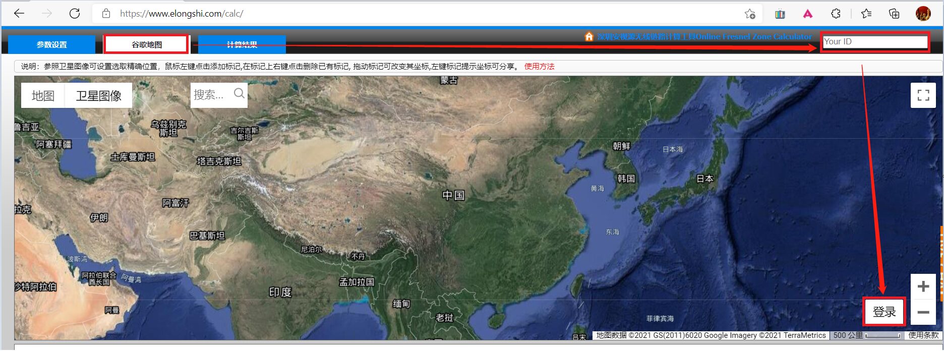 二、在“Your ID”栏填写您购买的会员ID(注意大小写),点击地图右下角的“登录”。(强烈建议大屏电脑或电视机,体验更好)
