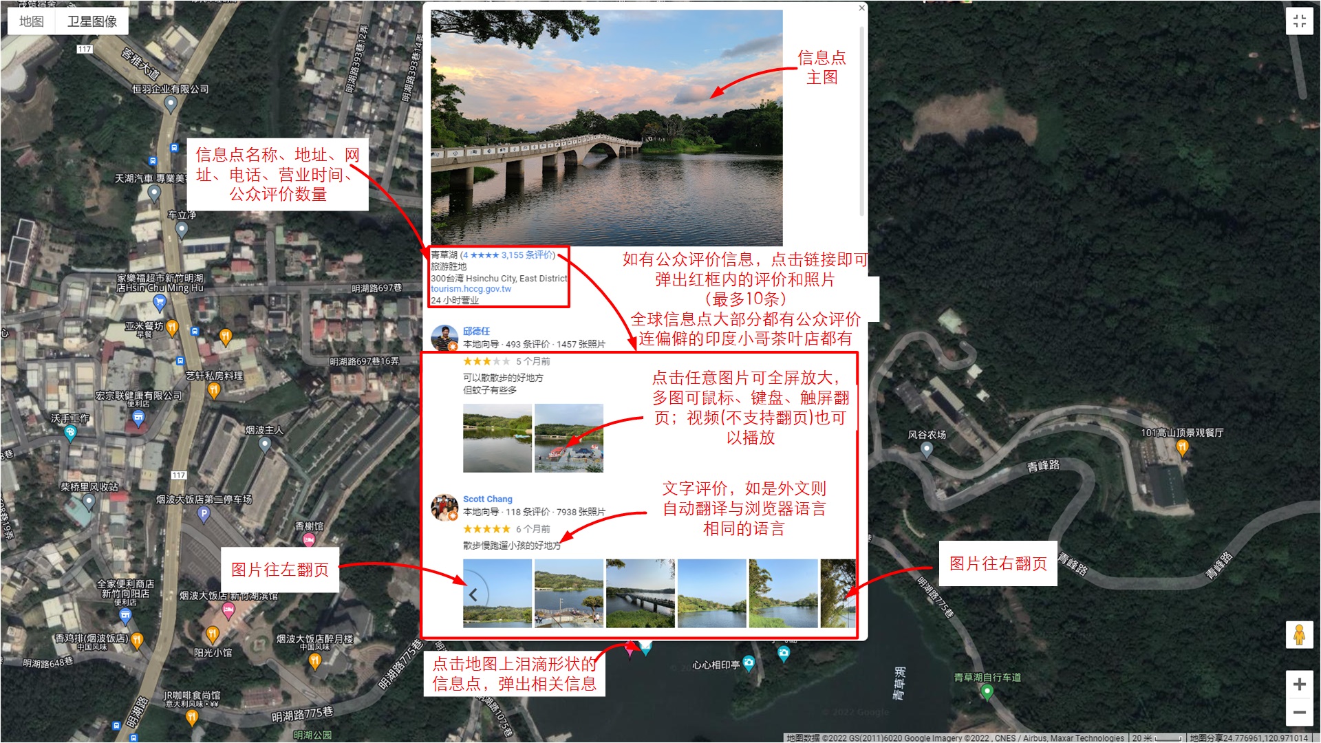 地图上信息点,点击可以弹窗照片、地址、电话、营业信息、公交、公众评价、分享的照片等(境外信息点弹窗资料会比较全)